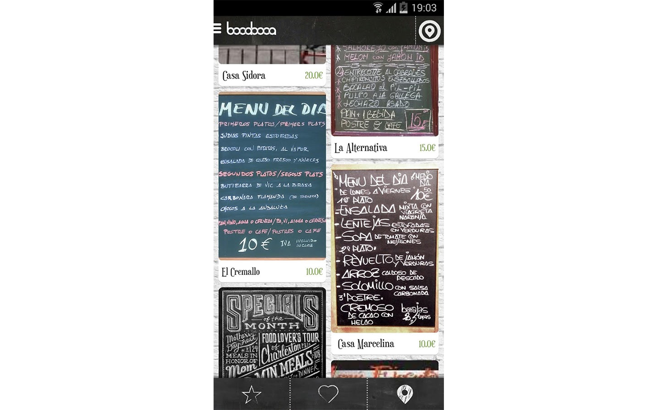 App para consultar los menús en los restaurantes o bares más cercanos. Los restaurantes publican sus pizarras mediante una fotografía mostrando sus menús diarios. Bocaboca es una herramienta que cuenta con la valoración de otros usuarios mediante un sistema muy original e intuitivo.